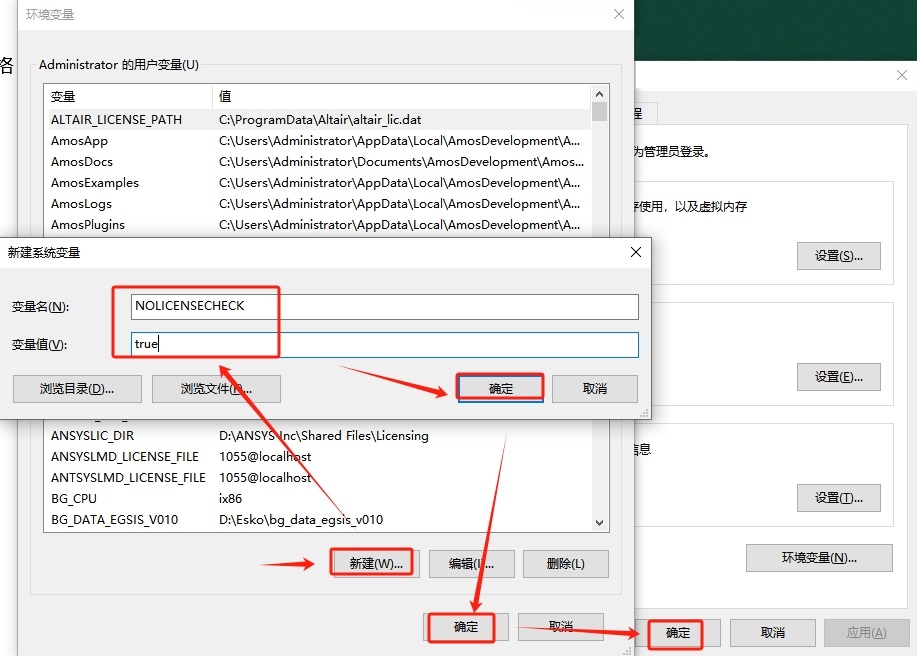 10、點擊【新建】,彈出對話框,變量名輸入【NOLICENSECHECK】,變量值輸入【true】,然后點擊確定-確定-確定。