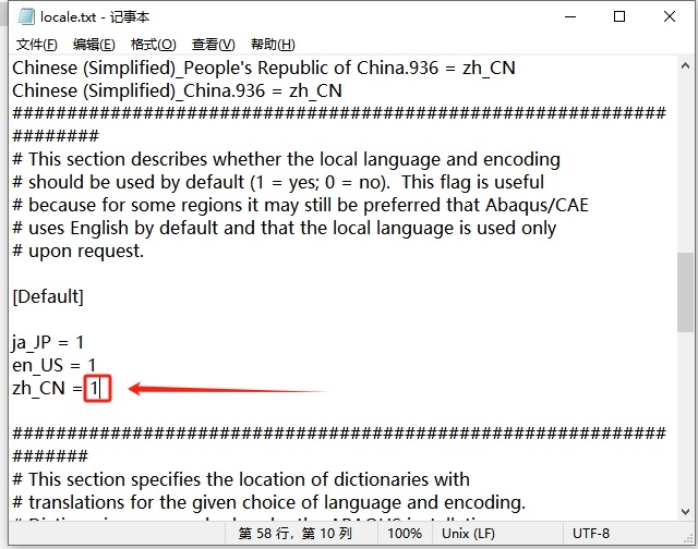 55、將第58行的【zh_CN = 0】改為【zh_CN = 1】,更改后,記得保存一下文本。