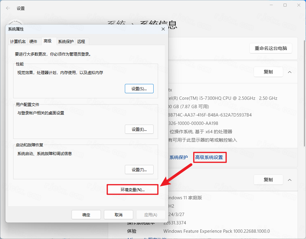 9.點(diǎn)擊【高級(jí)】,點(diǎn)擊【環(huán)境變量】