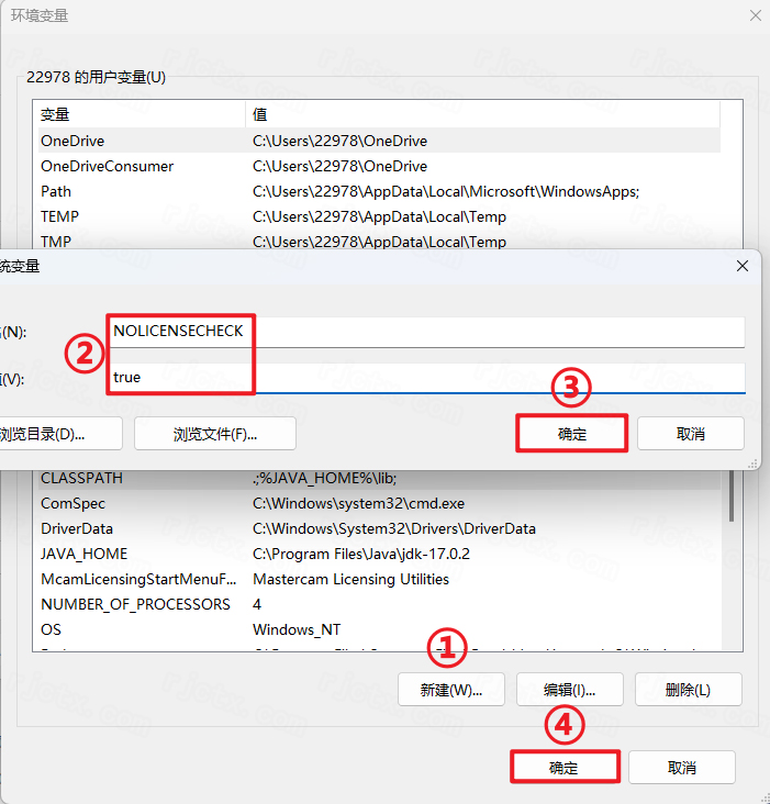 10.點(diǎn)擊系統(tǒng)變量下的【新建】,輸入變量名【NOLICENSECHECK】和變量值【true】,點(diǎn)擊【確定】,點(diǎn)擊【確定】