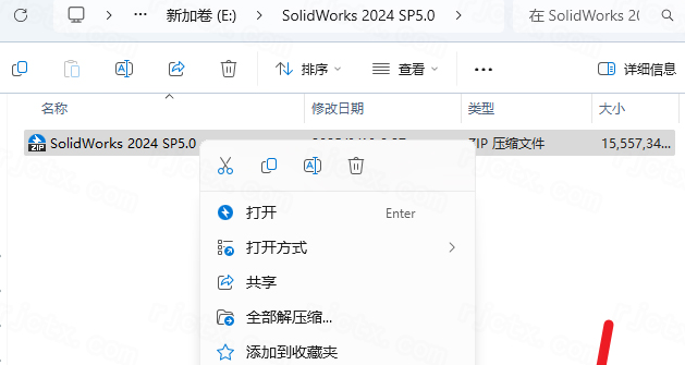 1.下載完成后,鼠標(biāo)右擊【SolidWorks 2024 SP5.0】壓縮包,選擇【解壓至此處】