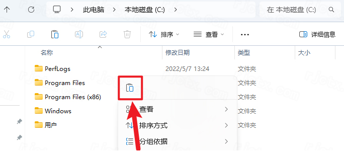 7.打開【C】盤根目錄,鼠標(biāo)在空白處右擊,點(diǎn)擊【粘貼】
