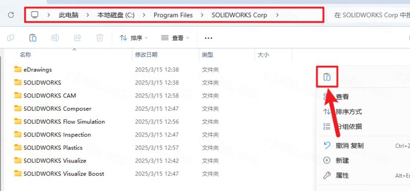 30.打開安裝到的盤符。因?yàn)檠菔窘缑鏇]有更改安裝目錄,所以在【C:\Program Files】下面可以看到【SOLIDWORKS Corp】文件,鼠標(biāo)在空白處右擊,點(diǎn)擊【粘貼】
