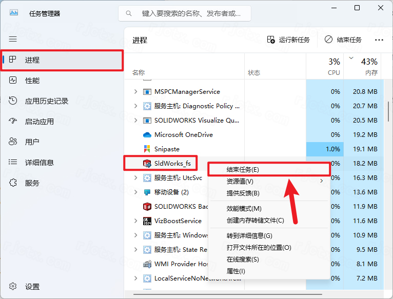 35.在進(jìn)程下找到【SldWorks_fs】,右擊點(diǎn)擊【結(jié)束任務(wù)】