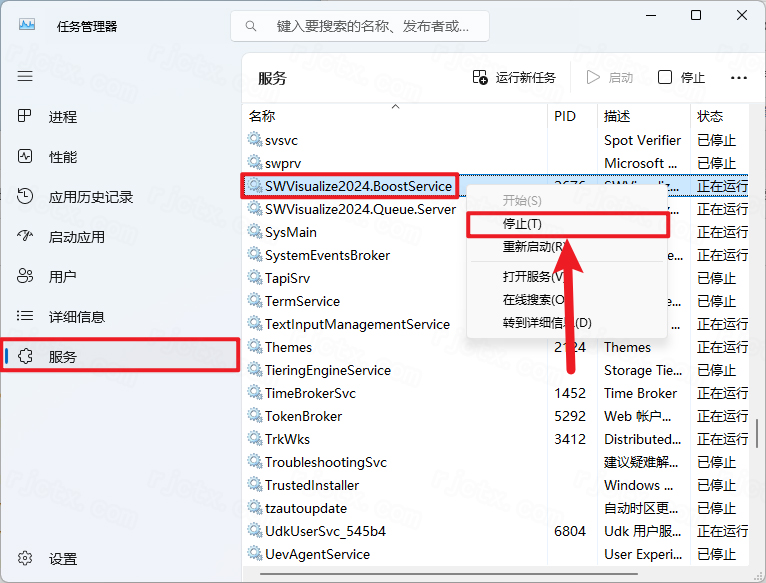36.在服務(wù)下找到【SWVisualize2023.BootsService】,右擊點(diǎn)擊【停止】