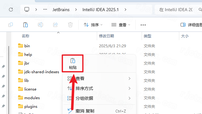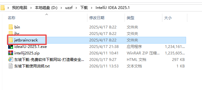 9.打開安裝包解壓后的【IntelliJ IDEA 2025.1】文件夾:①鼠標右擊【Crack】壓縮包②選擇電腦上安裝的解壓軟件③點擊【解壓到 Crack】,然后會得到下列三個文件夾