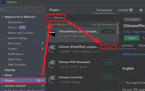 20.點(diǎn)擊【Plugins】,在搜索欄搜索【Chinese】,選擇漢化工具,點(diǎn)擊【Install】