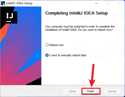 9.選擇【I want to manually reboot later】,點(diǎn)擊【Finish】