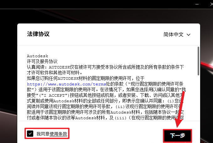 3.勾選【我同意使用條款】,點(diǎn)擊【下一步】