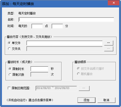 - 何時播放:支持一次性、每天、每周、每月定時播放。
