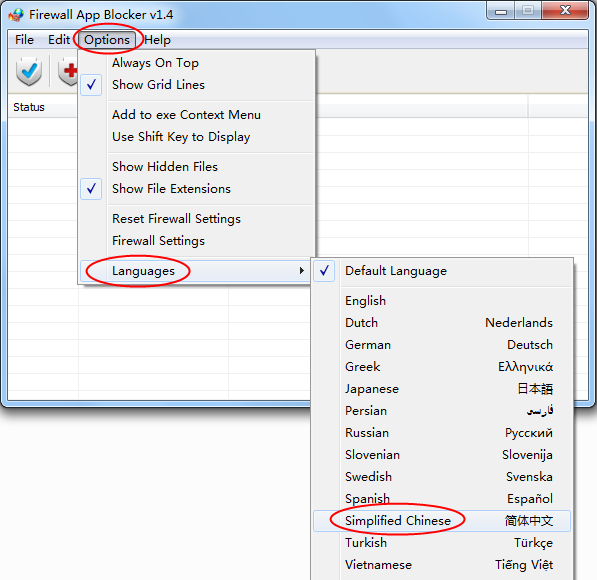 1、設(shè)置中文語(yǔ)言:在菜單中找到Options – Language,然后選擇簡(jiǎn)體中文即可。