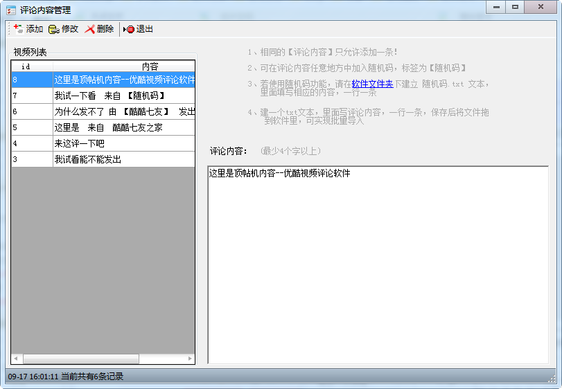 d.視頻評(píng)論內(nèi)容請(qǐng)參考b步驟操作,內(nèi)容越多越好,發(fā)視頻評(píng)論時(shí)會(huì)隨機(jī)調(diào)用里面的內(nèi)容