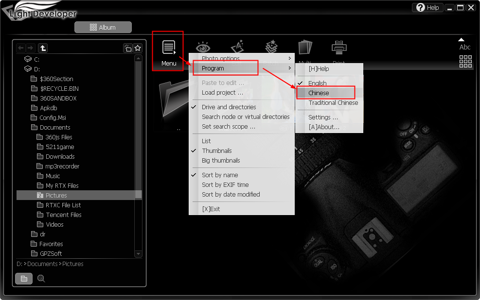 安裝完成后復(fù)制壓縮包中的basic目錄到安裝目錄中,然后啟動(dòng)程序,點(diǎn)擊Menu,在彈出的菜單中選擇Program,然后選擇Chinese,重新啟動(dòng)程序即可!
