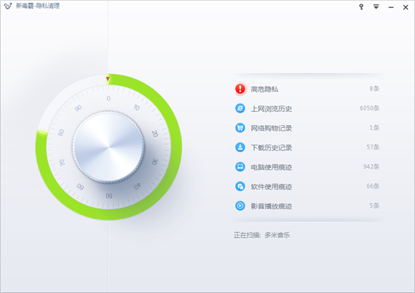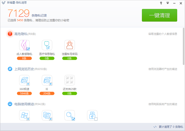 新毒霸隱私清理是從新毒霸開發(fā)版中提取的一個隱私清理軟件,可以清理掉一些日常上網(wǎng)和使用電腦過程中留下的隱私記錄,包括“高危隱私”、“上網(wǎng)瀏覽器歷史”、“網(wǎng)絡購物記錄”、“下載歷史記錄”、“電腦使用痕跡”和“影音使用痕跡”等。