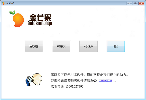 金芒果抽獎(jiǎng)軟件是一款2017最的、非常好用的,適用于公司、集團(tuán)、家庭等集體活動(dòng)的抽獎(jiǎng)環(huán)節(jié)的抽獎(jiǎng)工具。軟件功能強(qiáng)大,完全支持excel、txt格式的數(shù)據(jù)導(dǎo)入和導(dǎo)出,能夠保證大數(shù)據(jù)量情況下的抽獎(jiǎng)過程的順利平滑進(jìn)行。同時(shí),支持圖片格式的抽獎(jiǎng)方式;實(shí)時(shí)的記憶抽獎(jiǎng)結(jié)果,避免了斷電、死機(jī)等異常出現(xiàn)導(dǎo)致抽獎(jiǎng)記錄丟失的情況。優(yōu)化了穩(wěn)定的增、刪、改、查、棄算法,保證您的抽獎(jiǎng)活動(dòng)順利進(jìn)行。