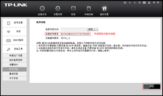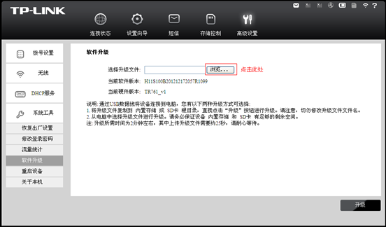 2、無線連接登陸TL-TR761管理界面,“高級設(shè)置》系統(tǒng)工具》軟件升級”界面,點擊“瀏覽”,選中“update.zip”文件,然后點擊“升級”。