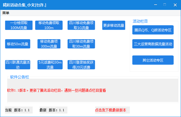 精彩活動(dòng)合集是一款綠色免費(fèi)的由吾愛網(wǎng)友小文制作的網(wǎng)絡(luò)活動(dòng)消息提醒工具。軟件功能強(qiáng)大,主要目的是及時(shí)獲取最新的活動(dòng)資訊,讓你贏在起跑線上。例如各省市的數(shù)據(jù)流量活動(dòng),軟件自動(dòng)檢測更新,無需擔(dān)心活動(dòng)會(huì)過期。后續(xù)版本還會(huì)添加騰訊Q幣、Q鉆的優(yōu)惠活動(dòng)。所有活動(dòng)都是真是有效。