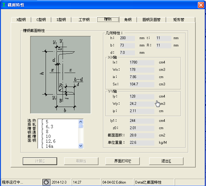 包括H型鋼,C型鋼,Z型鋼,工字鋼,槽鋼,角鋼,圓鋼及圓管,矩形管截面特性查詢及計算