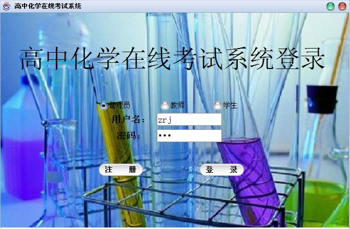 在用戶名出輸入登錄賬號(hào)名。選擇管理,輸入正確的用戶名和密碼,點(diǎn)擊登錄即可進(jìn)入系統(tǒng)。 同時(shí), 系統(tǒng)支持教師和學(xué)生登錄, 教師賬號(hào)可通過(guò)管理員賬號(hào)添加,而學(xué)生賬號(hào)可自行點(diǎn)擊注冊(cè)按鈕注冊(cè)。