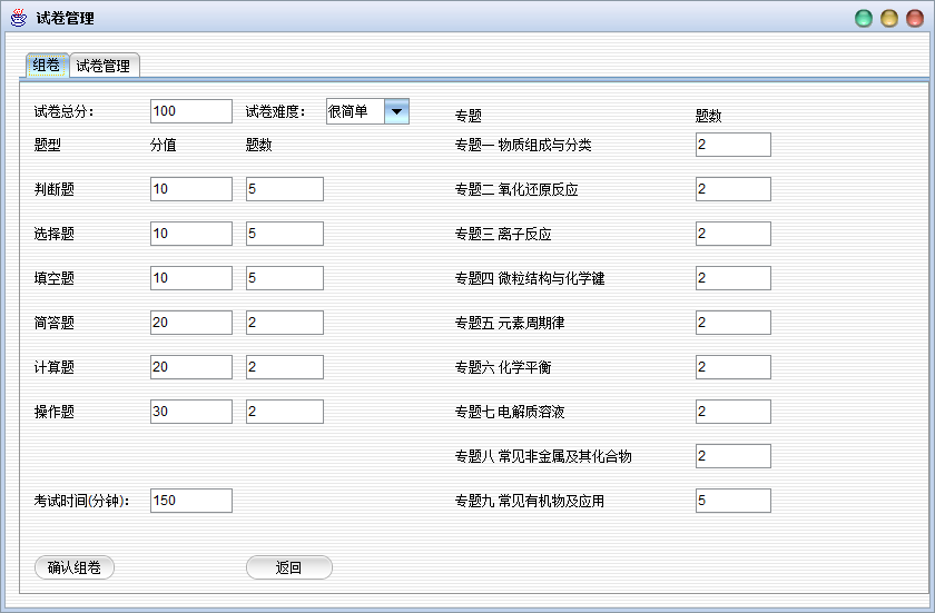 教師可以根據(jù)實(shí)際情況選擇試卷分?jǐn)?shù),試卷難度,各個(gè)題型的分?jǐn)?shù)、題目數(shù),各個(gè)專題的題目數(shù),以及考試時(shí)間來(lái)組卷。系統(tǒng)利用隨機(jī)加回溯的組卷算法完成組卷