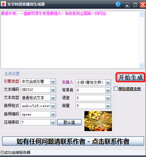 使用語(yǔ)音自動(dòng)生成器轉(zhuǎn)換語(yǔ)音之前可自定義引擎類型、文本編碼、文本類型、音頻格式、音頻編碼、壓縮等級(jí)、發(fā)音人、背景音、語(yǔ)速、音量等選項(xiàng)。