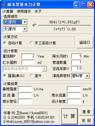 用于國內不同城市的暴雨強度計算、目前已集成了國內各省市的一些較大城市的數(shù)據(jù)資料,可進行屋面(單雨水斗系統(tǒng))、室外雨水流量、流速、管徑的計算。