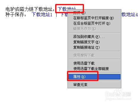 首先找到磁力鏈接地址,右擊鏈接按鈕,從彈出的菜單中選擇“屬性”項。