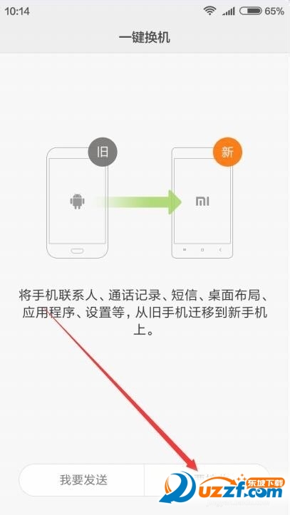 這時我們再打開舊設備,同樣的操作,找到一鍵換機功能菜單點擊并進入該功能,在一鍵換機界面,點擊“我要接收”按鈕即可。