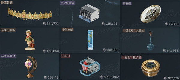 珠寶頭冠,生化培養(yǎng)箱,鱷魚蛋,荷爾美陶俑,ECMO,馬賽克燈臺(tái),心臟支架,藍(lán)寶石龍舌蘭,鉆石魚子醬。