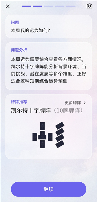 3、發(fā)送問題之后,會進行問題分析以及推薦牌陣,點擊【繼續(xù)】。