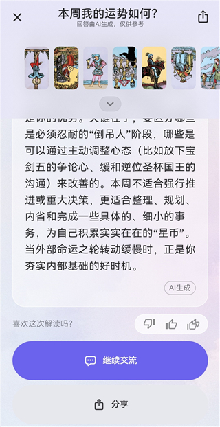 9、AI會根據(jù)你剛剛選擇的三張牌進行解讀,你也能繼續(xù)問其他問題。
