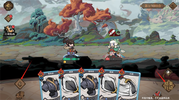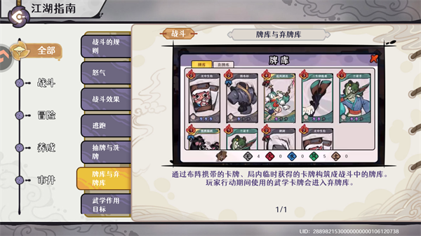 通過(guò)布陣攜帶的卡牌、局內(nèi)臨時(shí)獲得的卡牌構(gòu)筑成戰(zhàn)斗中的牌庫(kù)。玩家行動(dòng)期間使用的武學(xué)卡牌會(huì)進(jìn)入棄牌庫(kù)。