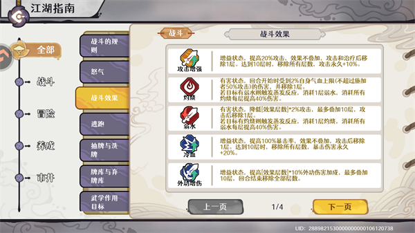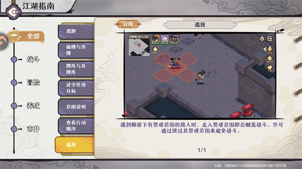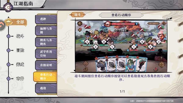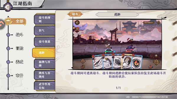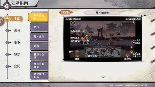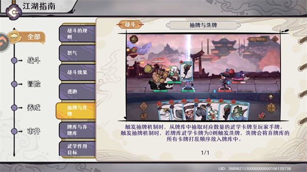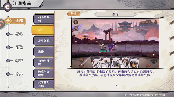 觸發(fā)抽牌機(jī)制時(shí),從牌庫(kù)中抽取對(duì)應(yīng)數(shù)量的武學(xué)卡牌至玩家手牌。觸發(fā)抽牌機(jī)制時(shí),若牌庫(kù)武學(xué)卡牌為0則觸發(fā)洗牌,洗牌會(huì)將棄牌庫(kù)的所有卡牌打亂順序放入牌庫(kù)中。怒氣為使用武學(xué)卡牌的費(fèi)用,玩家回合結(jié)束時(shí)回滿怒氣基礎(chǔ)怒氣為6,可通過(guò)提高少年境界提高基礎(chǔ)怒氣值。